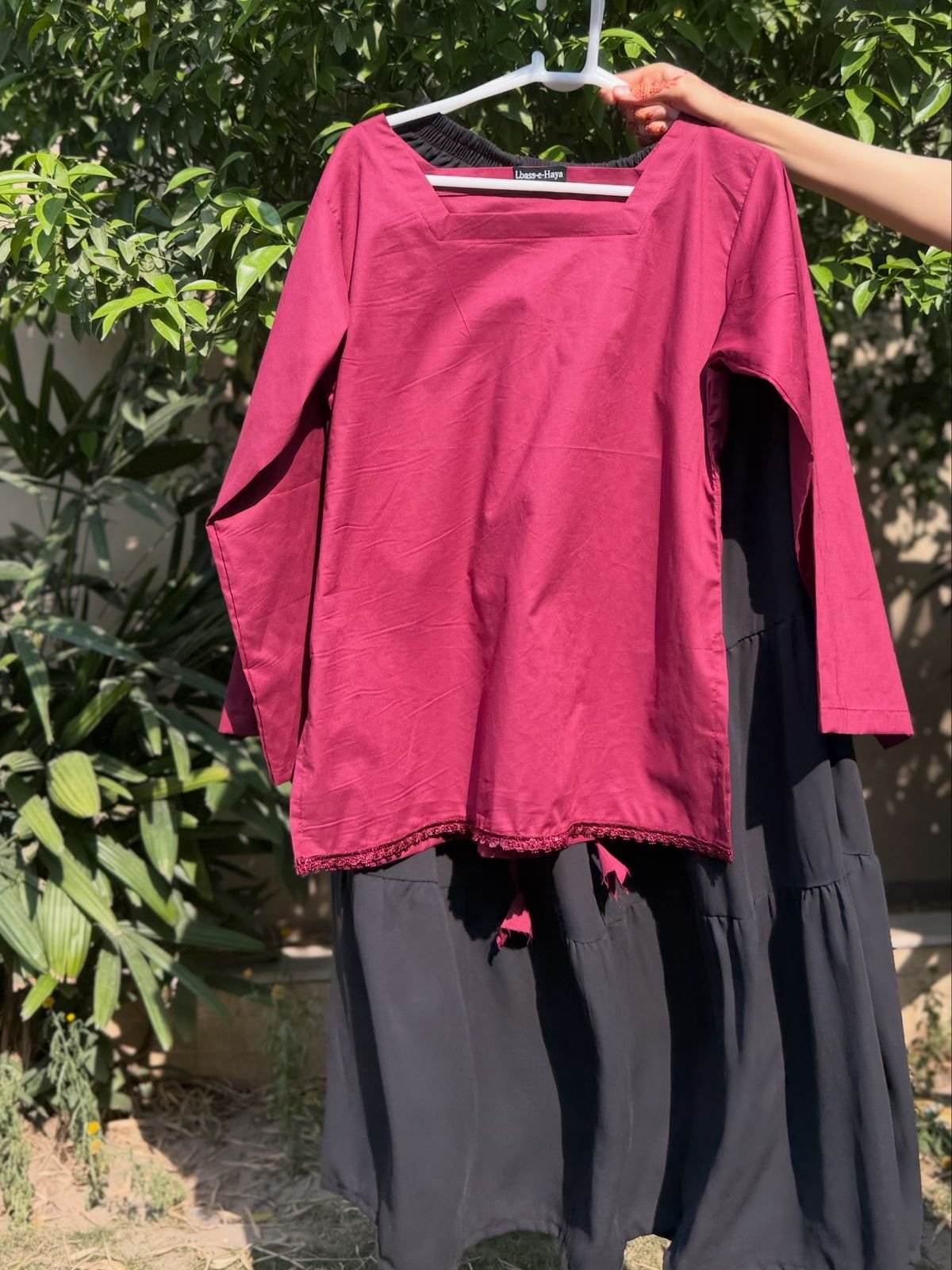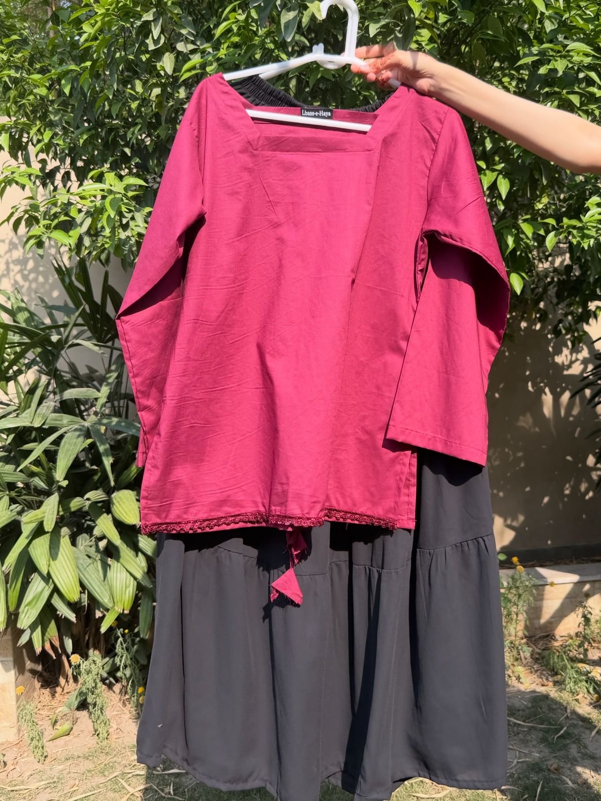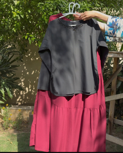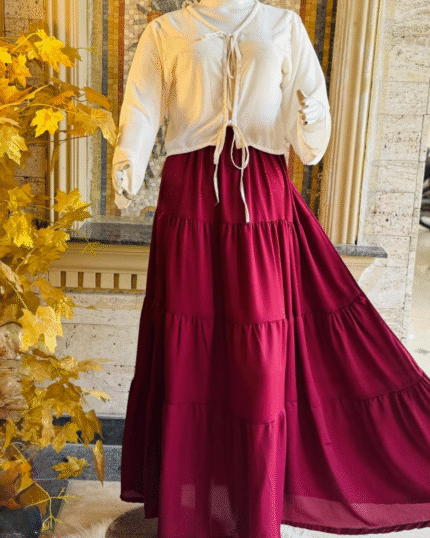 A stylish modest outfit perfect for casual wear, brunch, university, outings, and everyday fashion. The rich maroon top paired with a classic black maxi skirt creates a bold and elegant look.