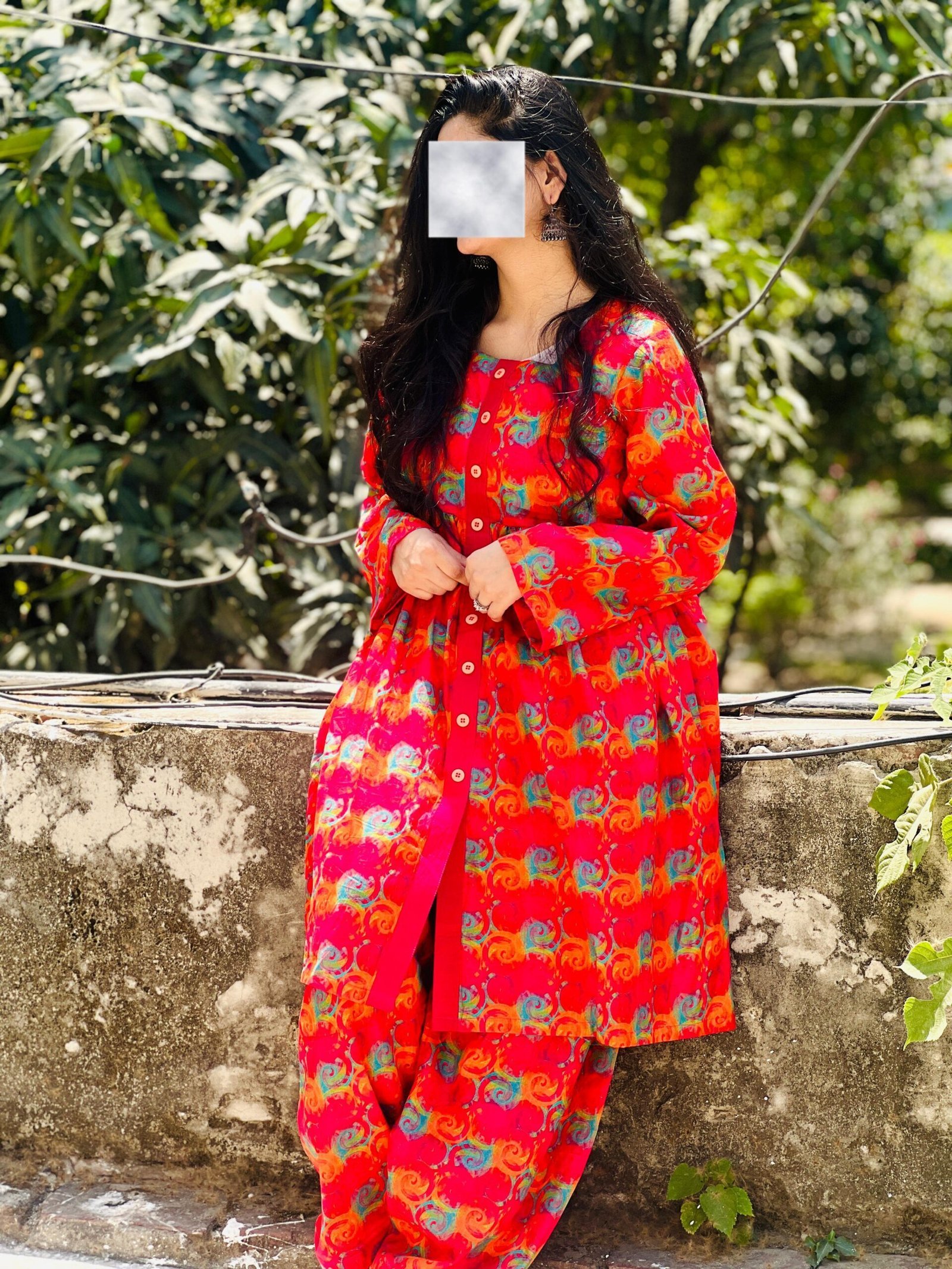 A bright orange dress 🍊 adorned with vibrant multicolour patterns 🌈 adds a joyful pop to any celebration.