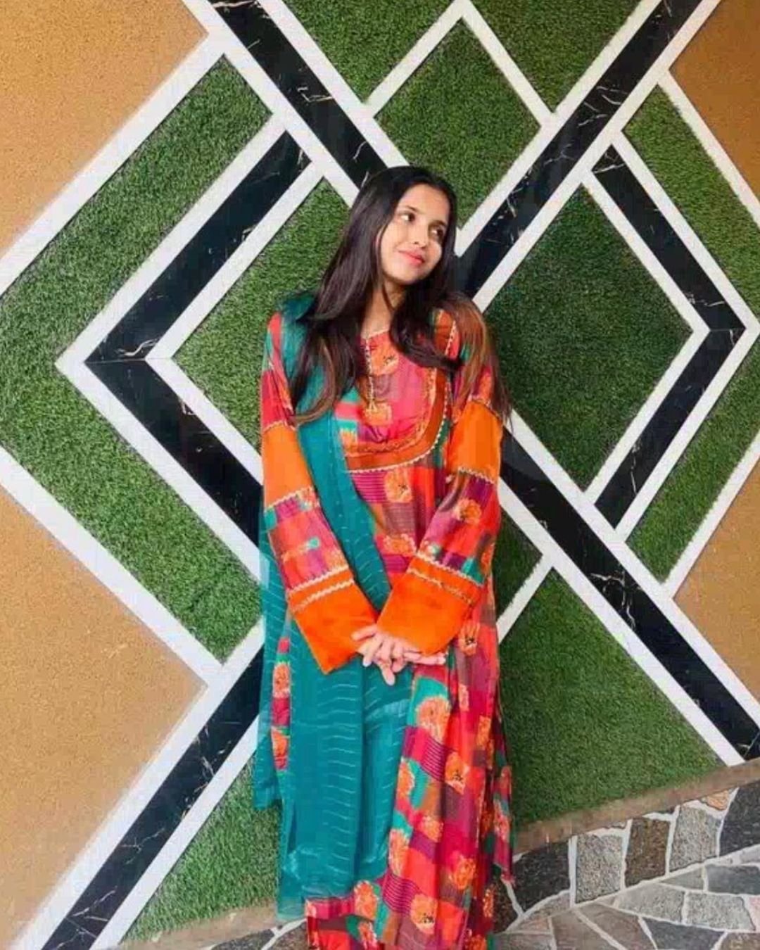 Bright Pink, Teal Blue, and Orange – A vibrant and eye-catching combination where bright pink adds a playful charm, teal blue brings a calming contrast, and orange gives the outfit a bold, festive touch. Together, they create a lively and colorful traditional look perfect for cheerful occasions