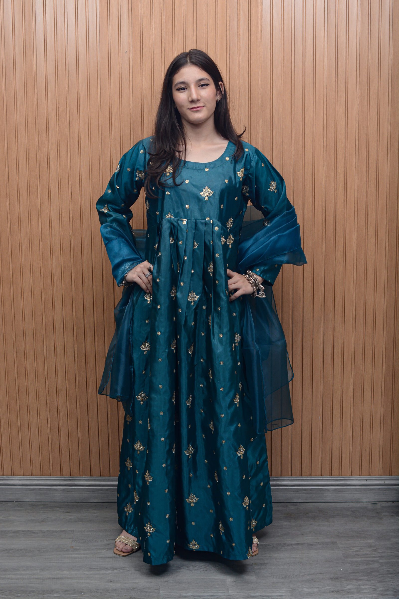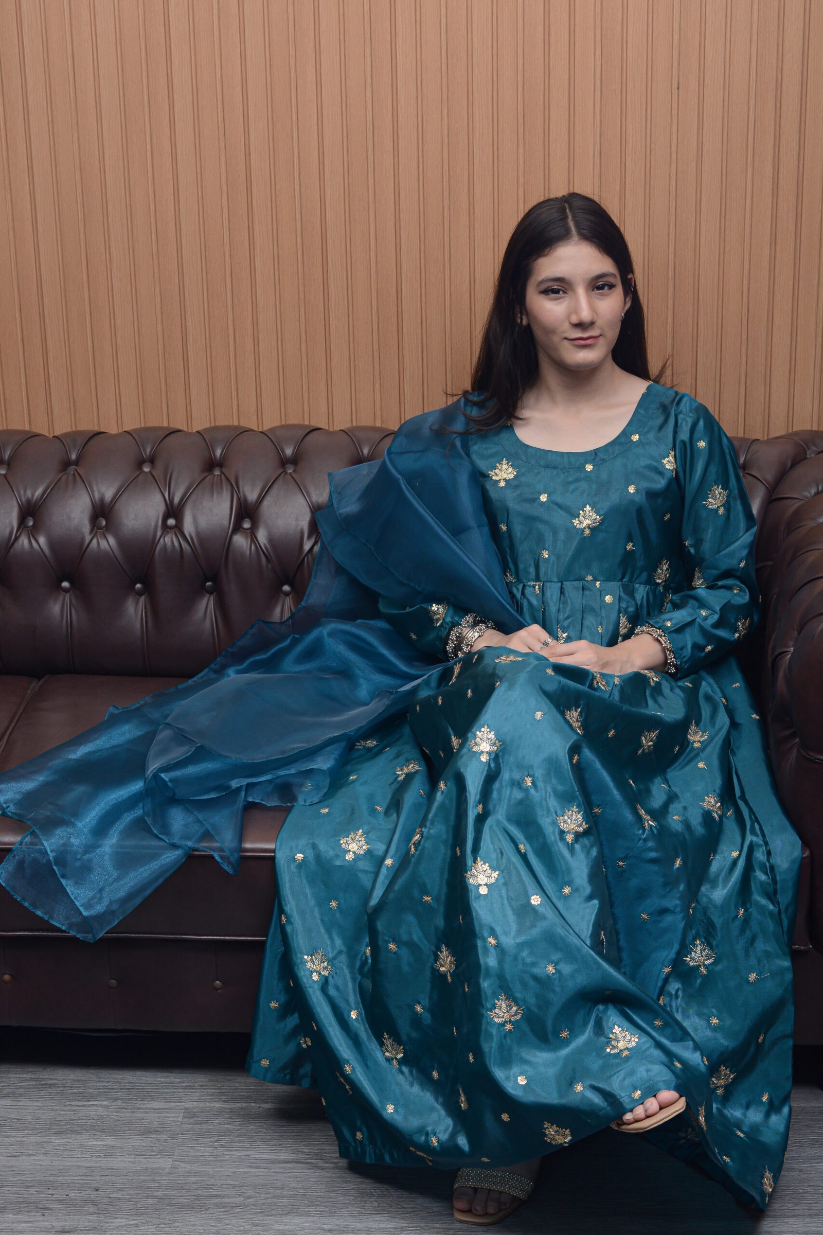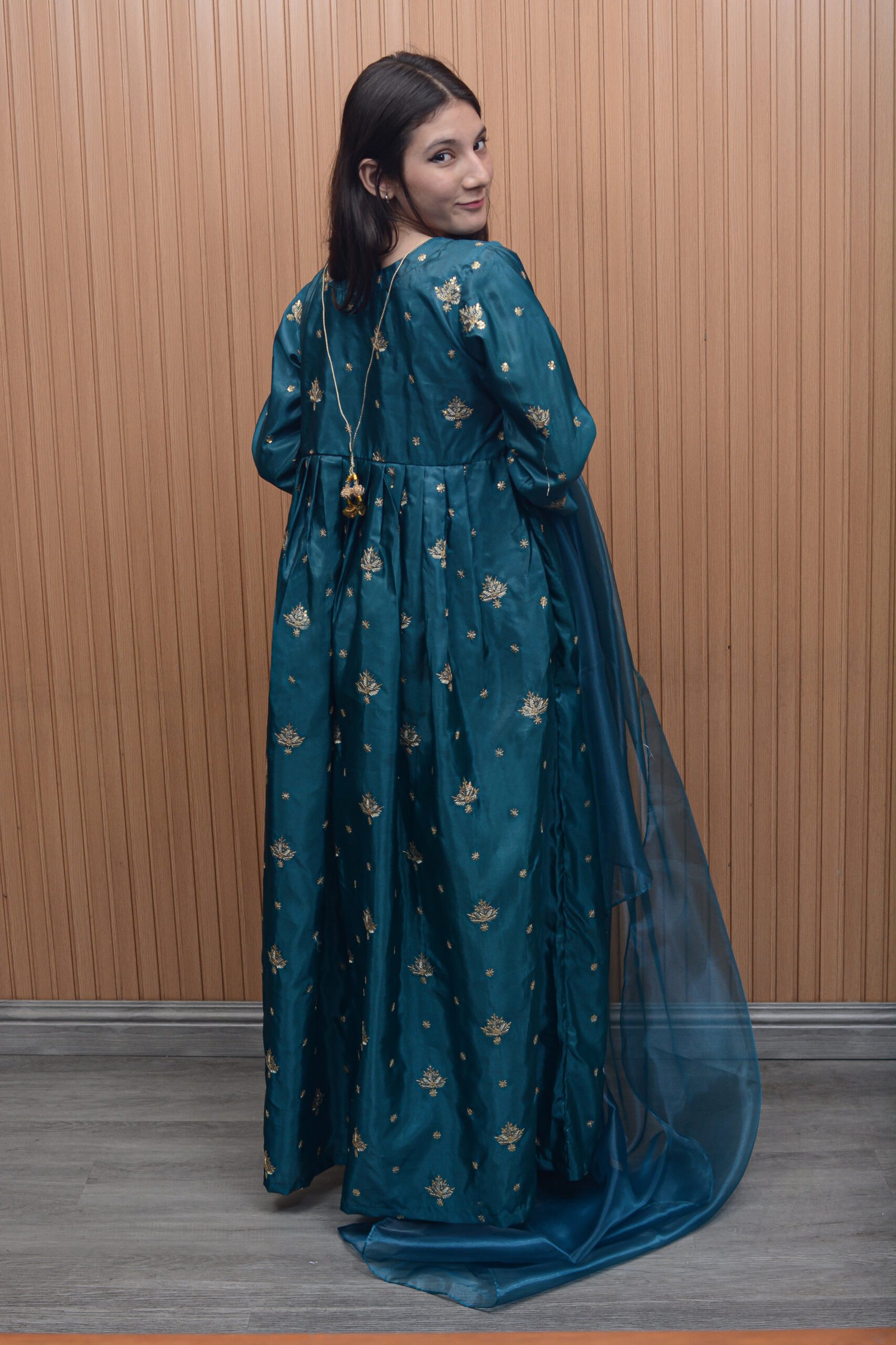 Teal Blue Katan Silk Embroidered Maxi Dress with Organza Dupatta