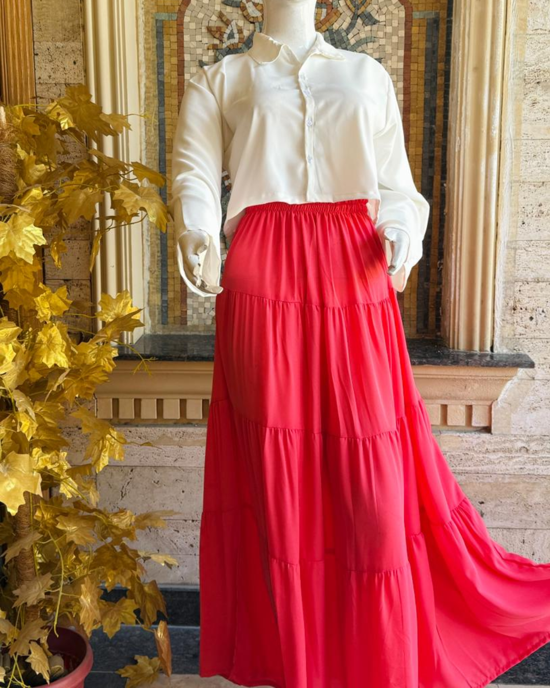 A chic and modest outfit perfect for casual wear, outings, university, brunch, and everyday styling. The crisp white shirt paired with a vibrant red maxi skirt creates a stylish and eye-catching look.
